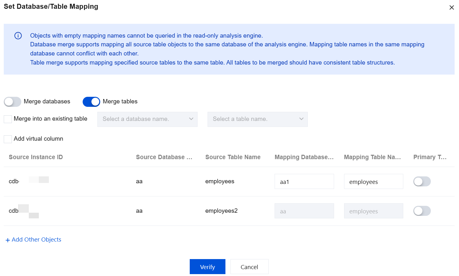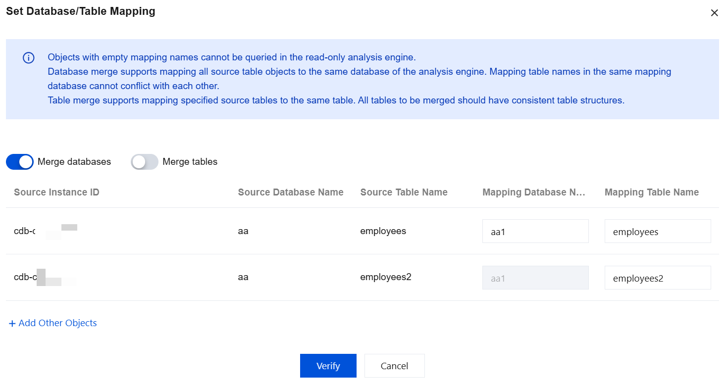 5. In the pop-up window, toggle on the Merge Table switch and click Verify. The mapping database names of all currently selected objects will be merged into the mapping table set in the object in the first row.