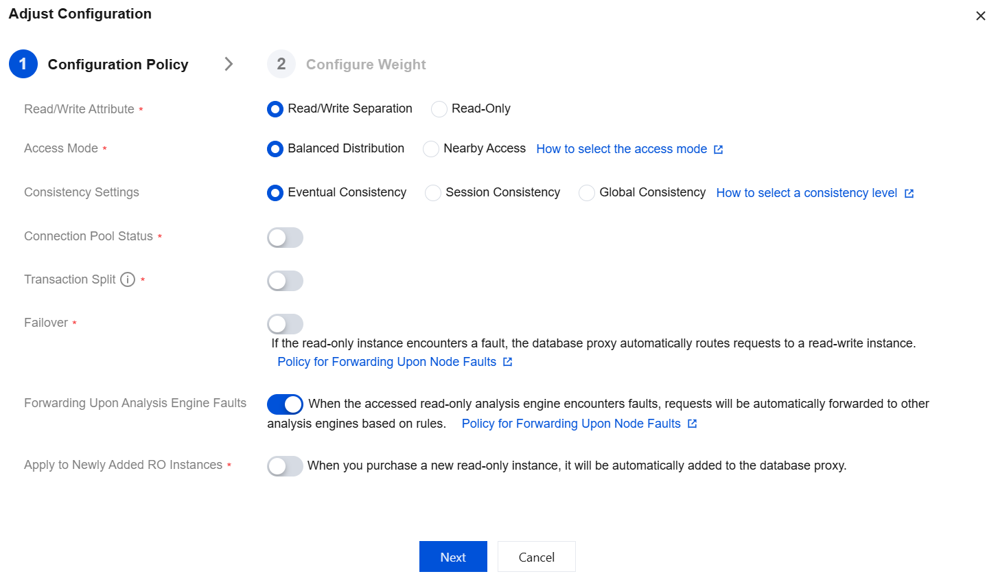 Currently, the above instance fault forwarding policies cannot be modified. By default, SQL statement forwarding upon read-only instance and read-write instance faults is enabled, while forwarding upon read-only analysis engine faults is disabled.