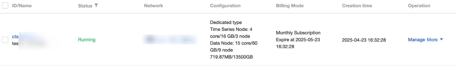 Configuration | Instance type, specification configuration information of computing nodes and data nodes Instance type: Only dedicated is supported. Time sequence node: 2 cores 8 GB / 3 nodes, corresponding to the CPU cores, memory specifications / quantity of computing nodes. Data node; 15 cores 60 GB/9 nodes, corresponding to the CPU cores, memory specifications/node quantity of data nodes; 719.87 MB/13500 GB, corresponding to the used disk capacity/total disk capacity. |