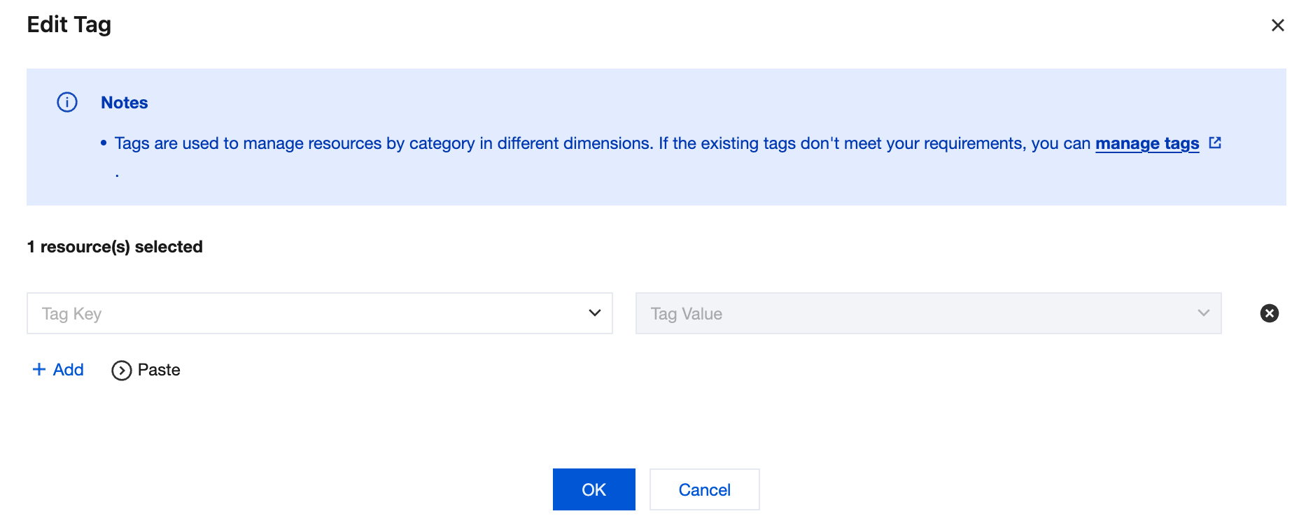 Click the target instance ID, and click on the right side of the Tag in the Basic Information area of the Instance Details page. 5. In the Edit Tag window, reselect the appropriate tag key in the Tag Key drop-down list and select the corresponding tag value in the Tag Value input box. Click Add to add multiple tags.