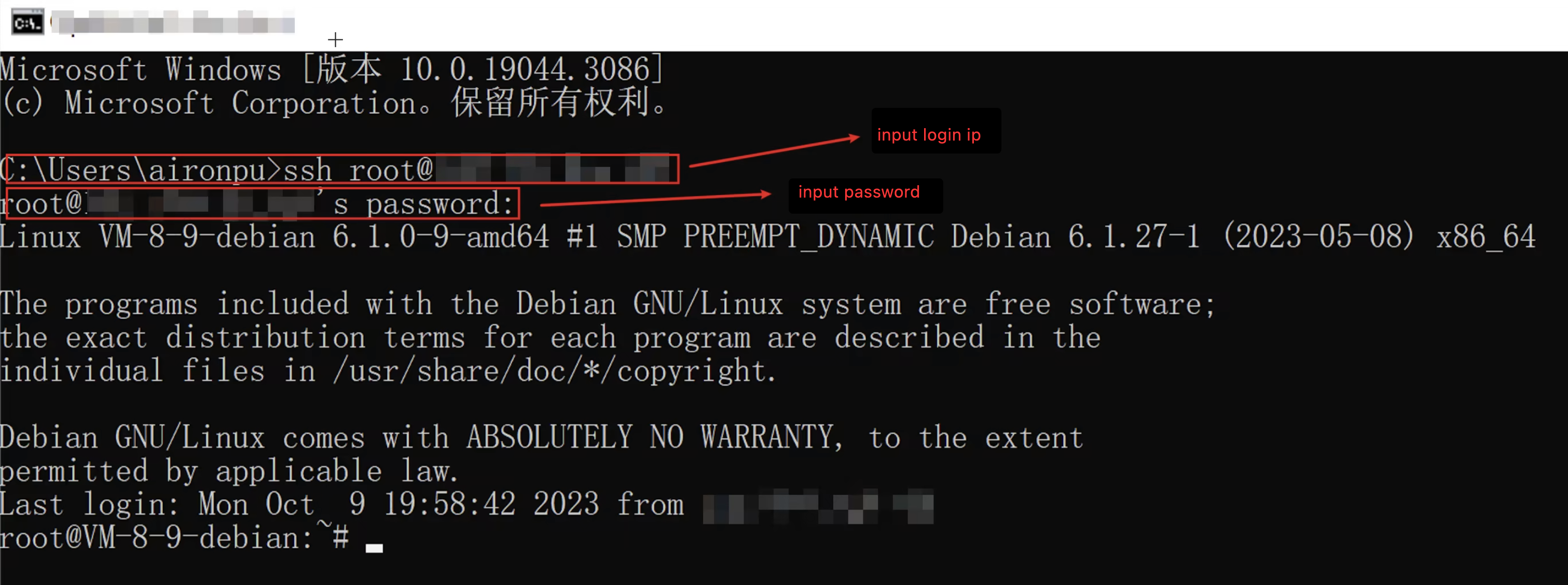 username is the obtained username in Prerequisites, such as root and ubuntu.IP address or domain name is the public IP address or custom domain of your Linux instance. You can view the instance's public IP address in the Lighthouse console.2. Enter the password you have obtained, and press Enter to log in.