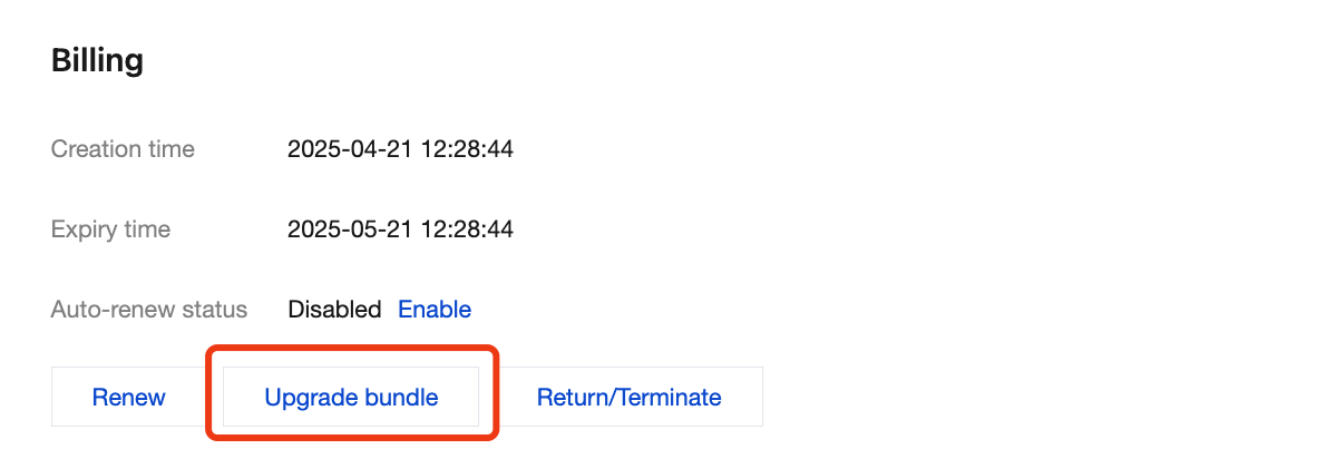 2. In the server list or table view, find and enter the details page of the instance whose package is to be upgraded. 3. Select Upgrade bundle in “Billing”. As shown below: