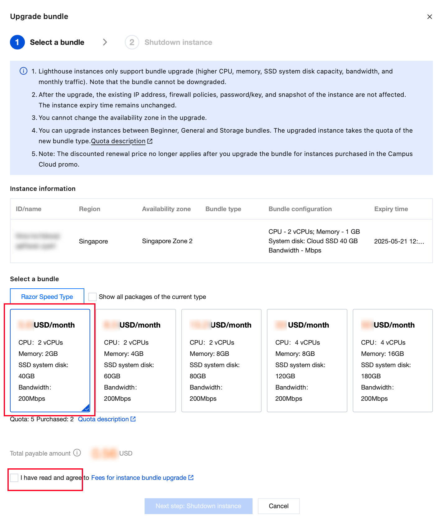 When upgrading the Razor Speed Bundle for an instance, you can only select another Razor Speed Bundle with higher specifications.