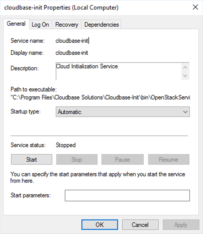 8. Select the General tab and click Start under Service Status to manually launch the cloudbase-init service and check whether there are any errors.