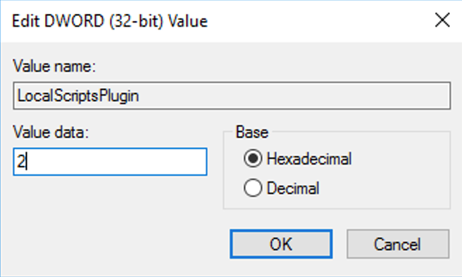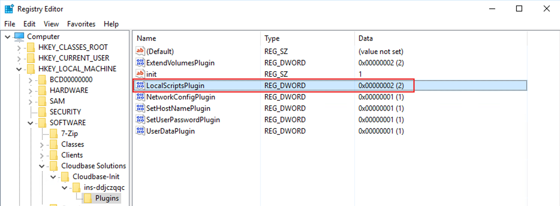 12. Find and double-click all LocalScriptsPlugin registry keys under ins-xxx, and then check whether the value of LocalScriptsPlugin is 2. See the following figure: