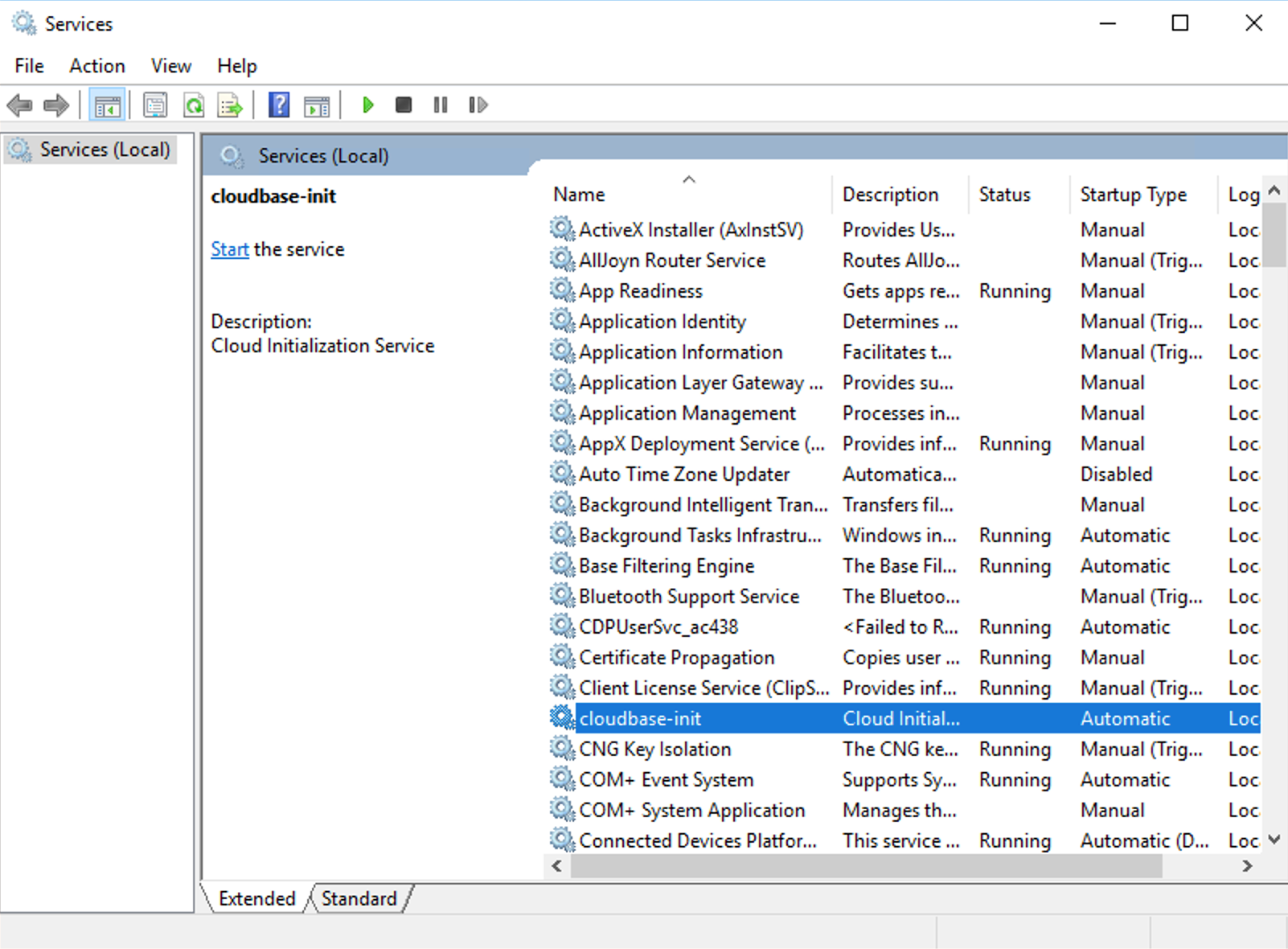 4. In the Services window, check whether the cloudbase-init service exists. See the following figure:
