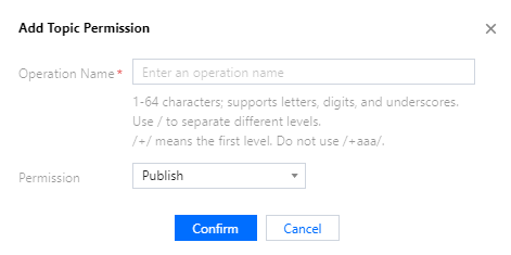 data, set the operation permission to Subscribe and Publish, and click Confirm.