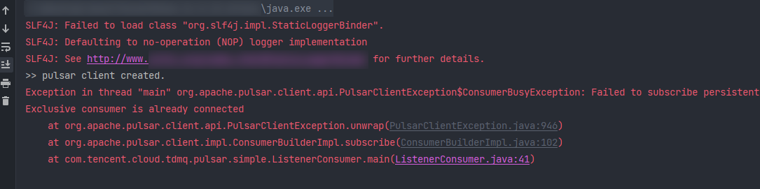 // Construct a consumer.Consumer<byte[]> consumer = pulsarClient.newConsumer()// Full topic path, in the format of persistent://cluster (tenant) ID/namespace/topic name, copied from the Topic page..topic("persistent://pulsar-xxx/sdk_java/topic1")// You need to create a subscription on the topic details page in the console. Specify the subscription name here..subscriptionName("sub_topic1")// Declare the consumption mode to be the Exclusive mode..subscriptionType(SubscriptionType.Exclusive).subscribe();