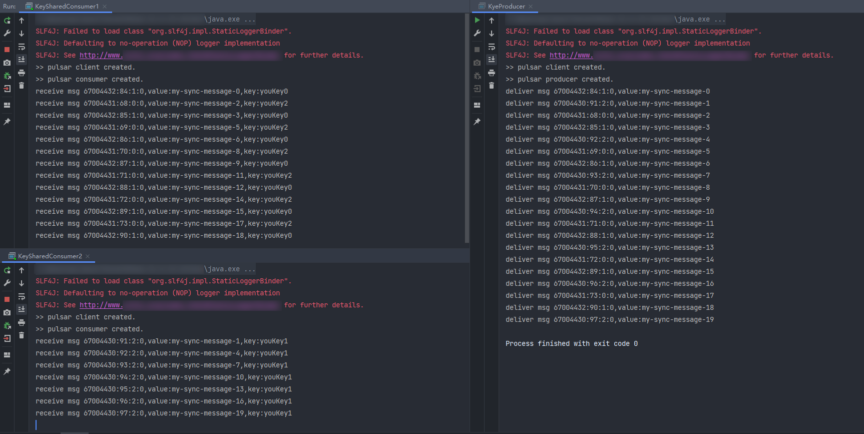 // Construct a producer.Producer<byte[]> producer = pulsarClient.newProducer().topic(topic).enableBatching(true).batcherBuilder(BatcherBuilder.KEY_BASED).create();// Set the key when messages are sent.MessageId msgId = producer.newMessage()// The message content..value(value.getBytes(StandardCharsets.UTF_8))// Set the key here. Messages with the same key are distributed only to the same consumer..key("youKey1").send();