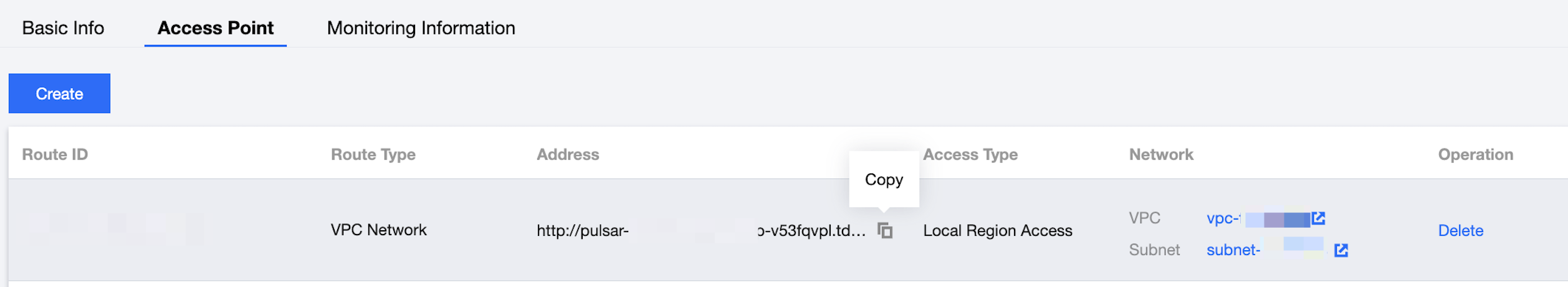 4. Click Submit to complete the VPC network access configuration. In the access point list, you can copy the access point address.