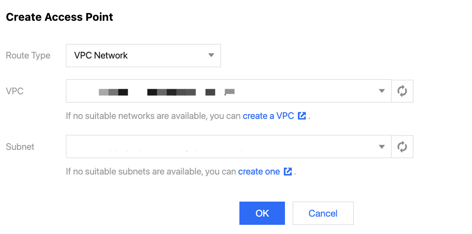 3. Select the Access Point tab, click OK, and select the VPC network as the routing type. In the New VPC Access Point dialog box, select the VPC and subnet, and fill in the remarks.