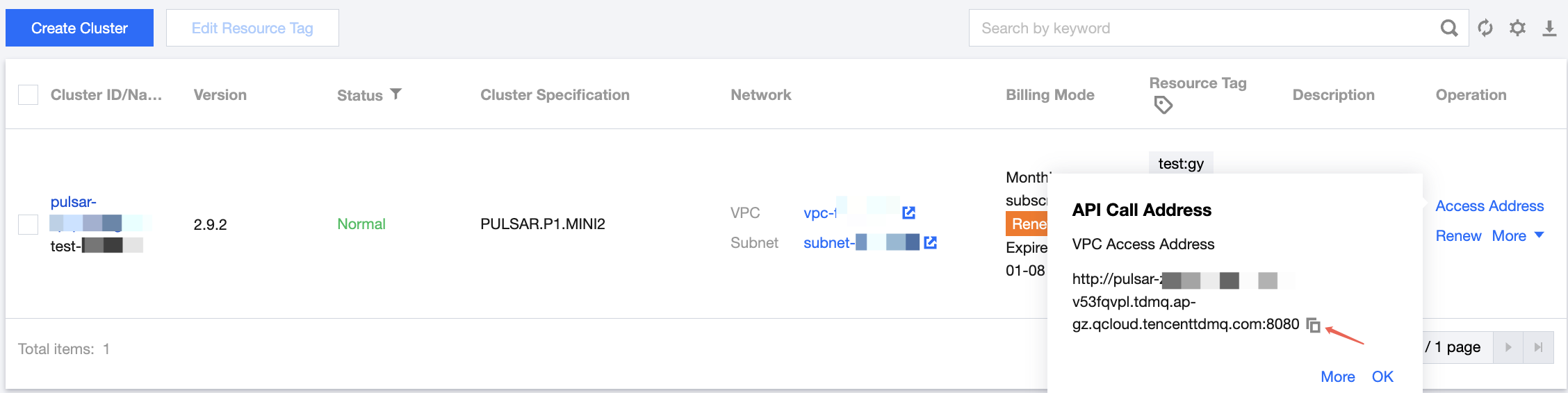 On the Cluster page, obtain the information by clicking Access Address in the operation column. Select different access points based on the network type.