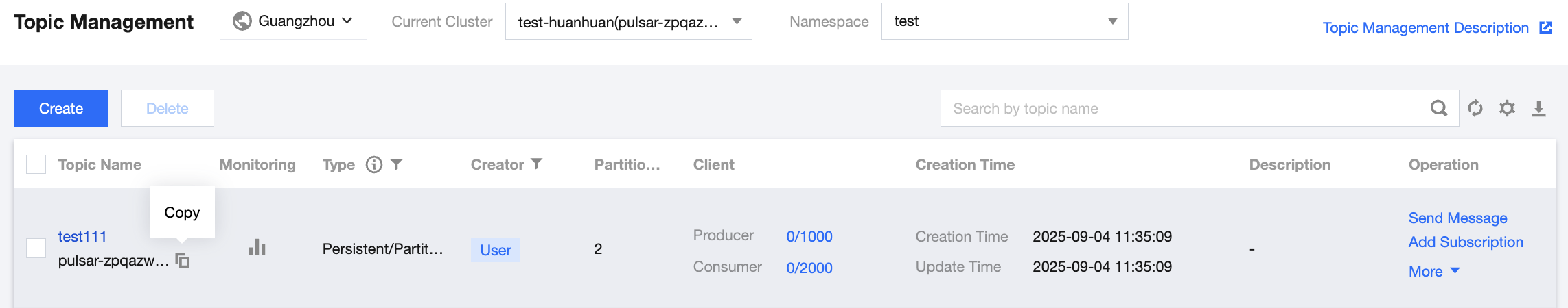 On the Topic page in the console, copy the topic name. The format is clusterid/namespace/topic.
