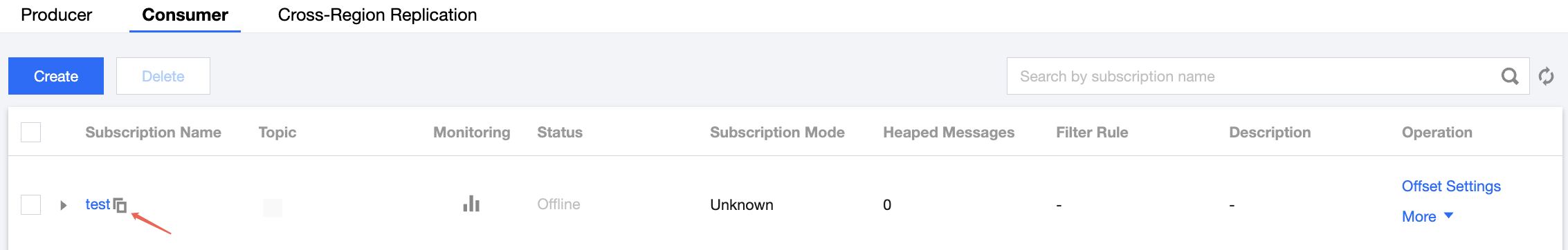 On the Consumer tab of the topic details page, copy the subscription relationship name.