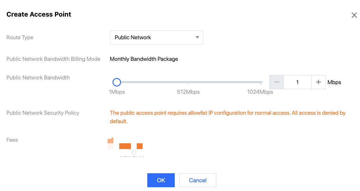 Enabling public network bandwidth will incur additional charges. For details, see Pricing. Creating a Public Network Access Point
