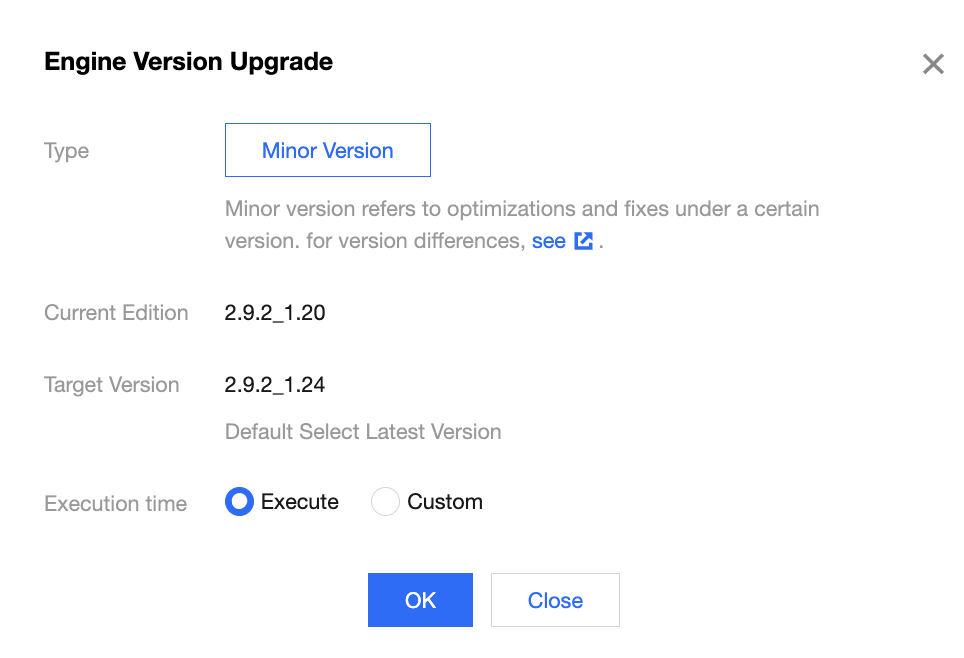 Target Version: The target version will be upgraded to the latest version by default. The system automatically detects minor versions. If the Minor Version button cannot be selected, it indicates the cluster is already on the latest minor version. For differences between minor engine versions, see Cluster Version Updates. Execution Time: You can select Execute or Custom (any time within the next 24 hours). It is recommended to perform the operation during off-peak hours.