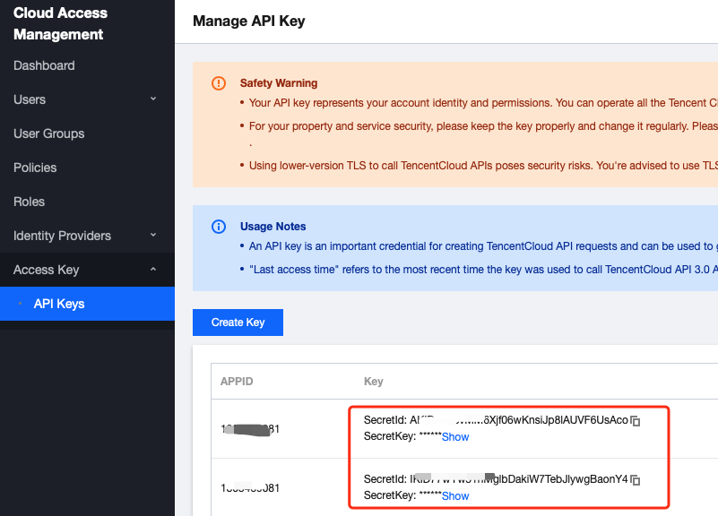 SECRET_ID、SECRET_KEY | 云 API 密钥,登录 访问管理控制台,在访问密钥 > API 密钥管理页面复制。 |