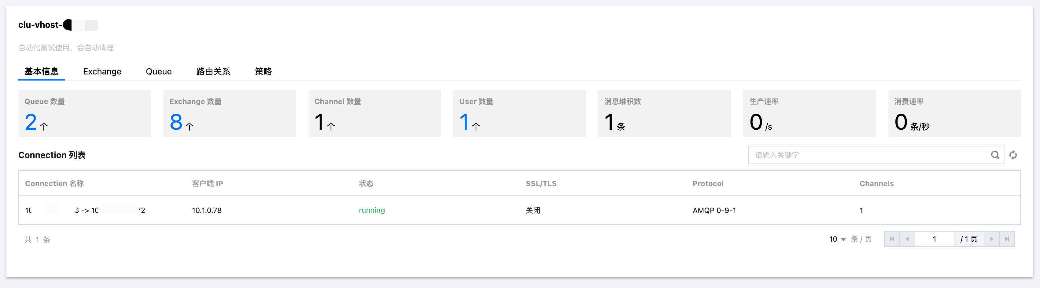 Connection list: Shows the current Vhost connection list information. You can monitor client connection status in real time through this information, check for abnormal connections (such as long-term idle or frequent disconnections), and quickly locate problems.