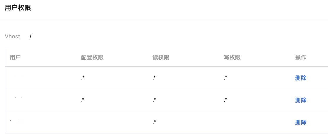 3. Click View User Permission in the Vhost operation bar to see the list of users and permission scope under this Vhost. You can delete no longer required user permissions according to needs.