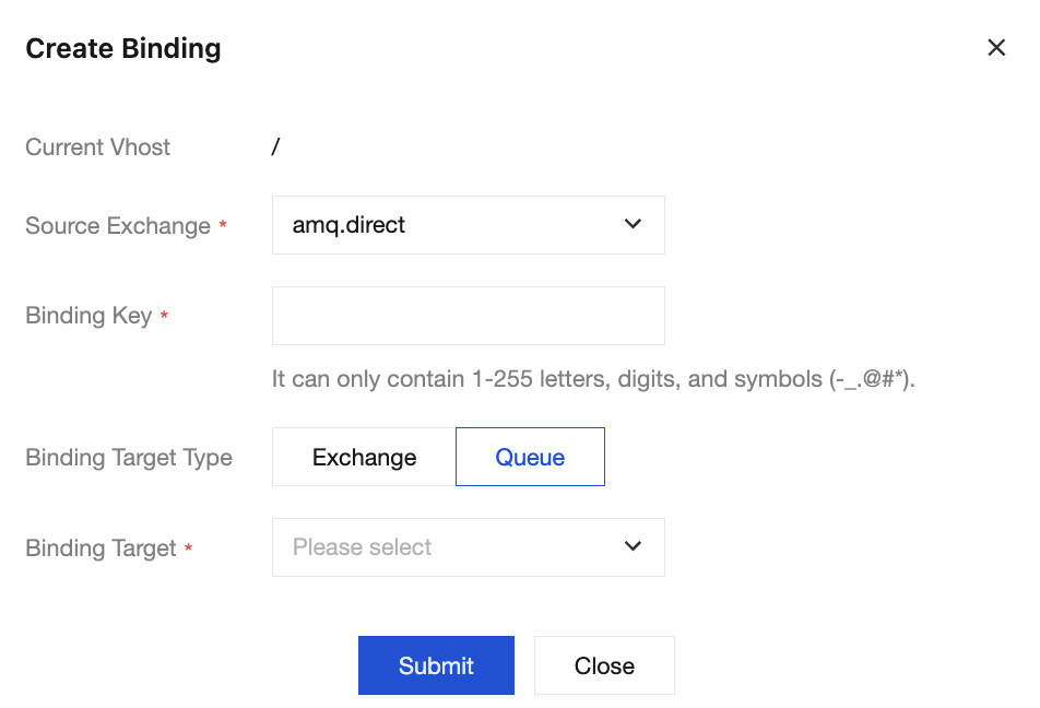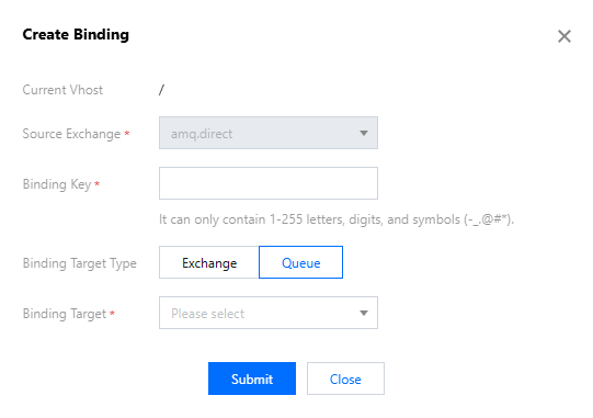 2. In the Add Binding Relationship pop-up window, set the source exchange, Binding Key, binding target type, and binding target, and then click Submit to complete the creation of the binding relationship.