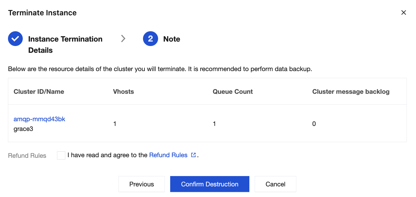 3. In the deletion pop-up window, confirm the resource details and click Next. After reading the refund rules and confirming the refund details, click Confirm Destruction to delete the cluster.