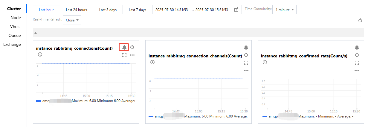 The monitoring policies of Serverless Edition clusters cover multiple dimensions: cluster, vhost, queue, and exchange.