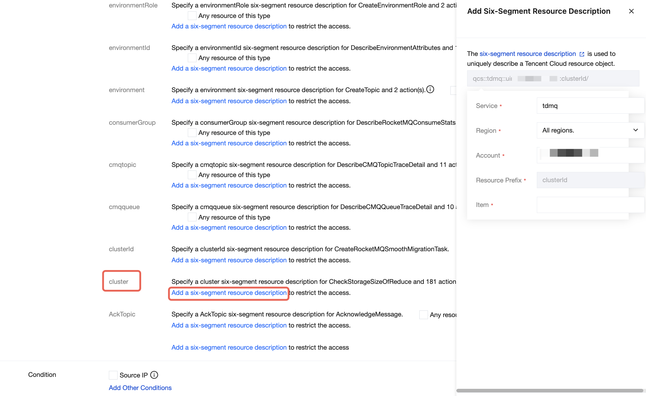 5. In the Resource section, select Specific resources, and locate the cluster resource type. You can check Any resource of this type (authorize all cluster resources) on the right, or click Add a six-segment resource description (authorize specific cluster resources). In the pop-up sidebar dialog box, enter the cluster ID in the Resource Prefix field.