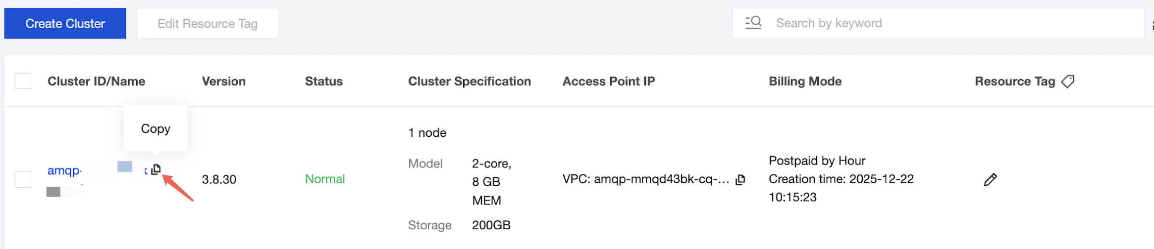 2. In the left sidebar, select Cluster. Select the target region and copy the ID of the target cluster.