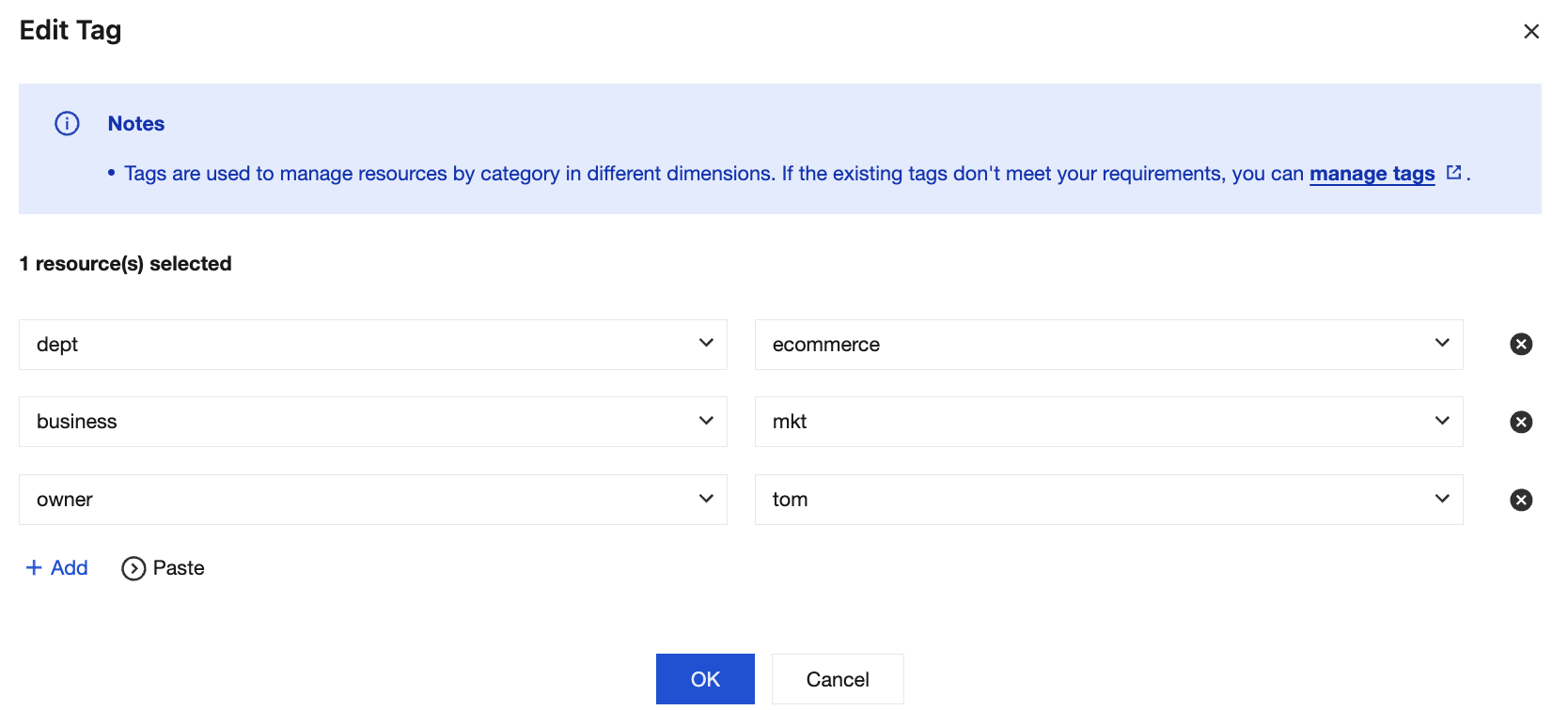 If the existing tags do not meet your requirements, go to the Tag Management page to create tags. 4. Click OK. The system displays a message, indicating that the modification is successful. You can view the tags bound to the cluster in the Resource Tag column of the cluster.