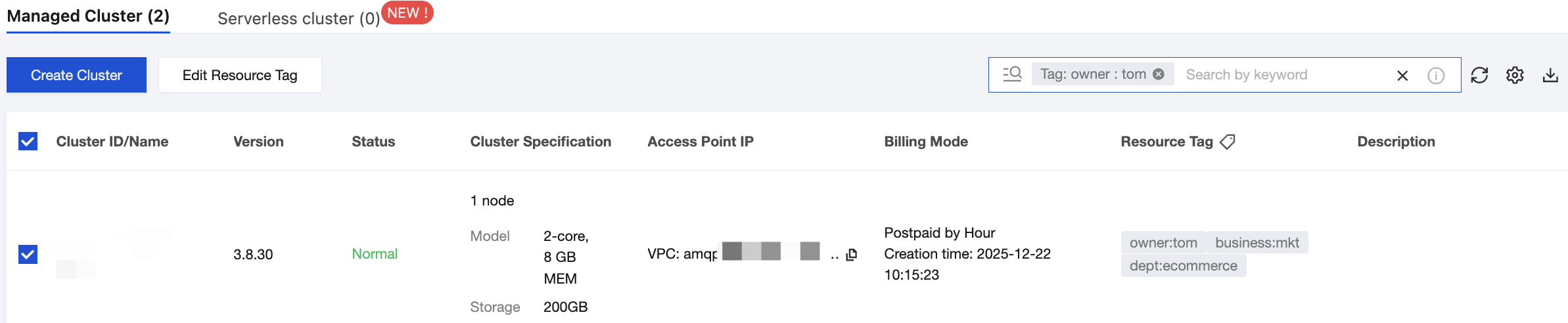 Managed Edition clusters can only be viewed in the RabbitMQ console, and the unified management of resource tags in the Tag Management console is not currently supported.
