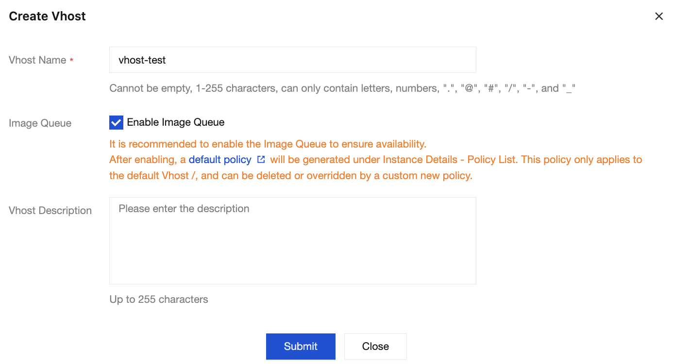 After RabbitMQ cluster creation, the system automatically creates a vhost named “/” under the cluster. You can directly use this vhost for subsequent steps or follow the steps below to recreate one.