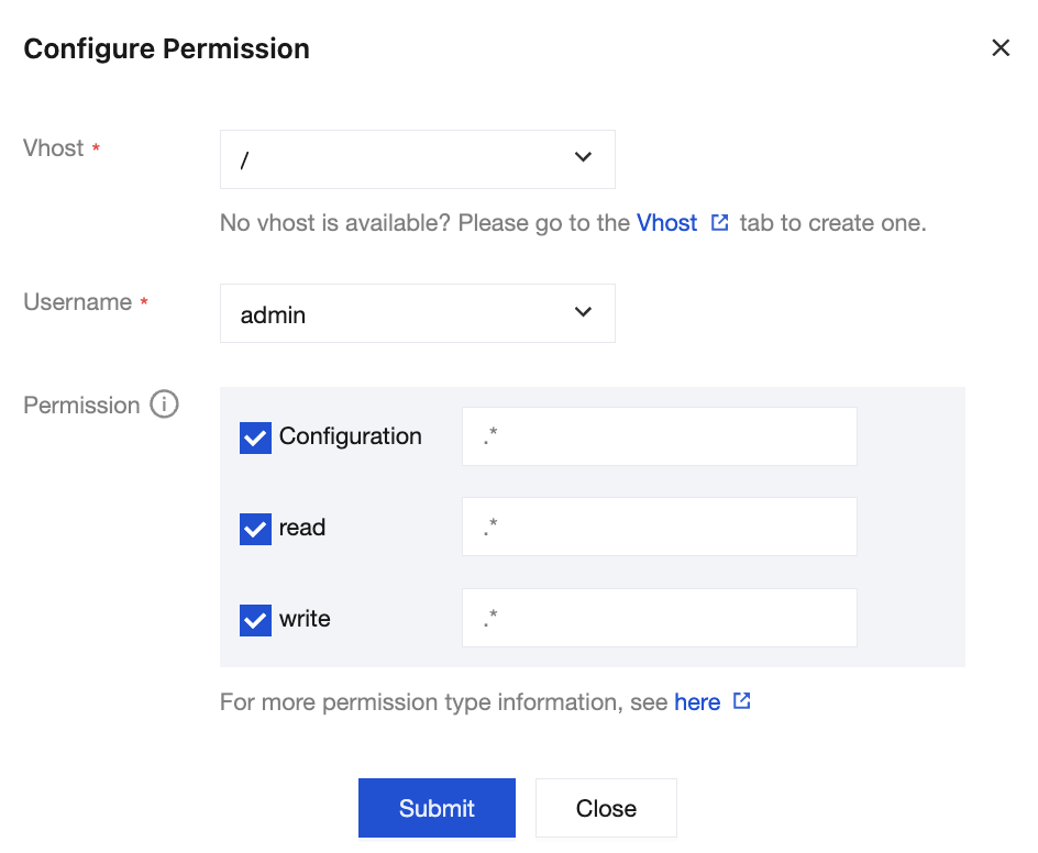 Permissions refer to the user’s operation permissions on the exchanges and queues under the vhost, including configuration and read/write permissions.
