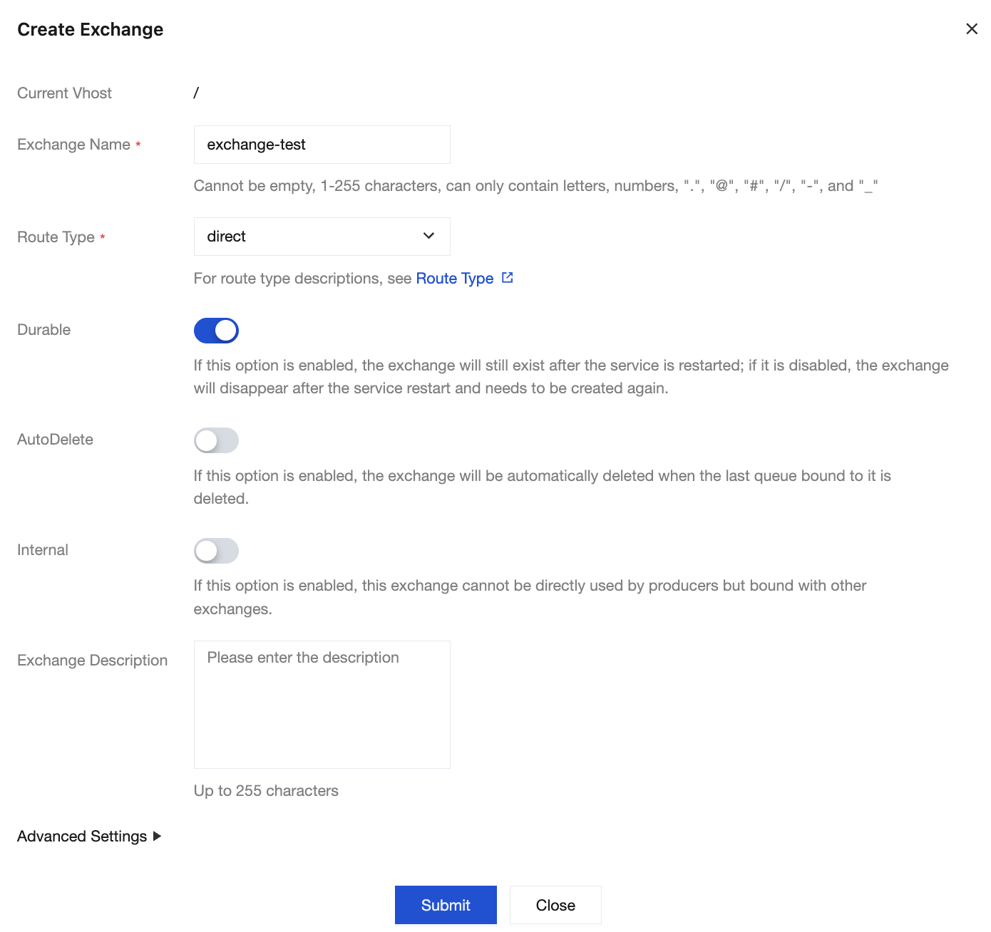 After RabbitMQ cluster creation, the system automatically creates an exchange named "amq.default" under the cluster. You can directly use this exchange for subsequent steps or follow the steps below to recreate one.