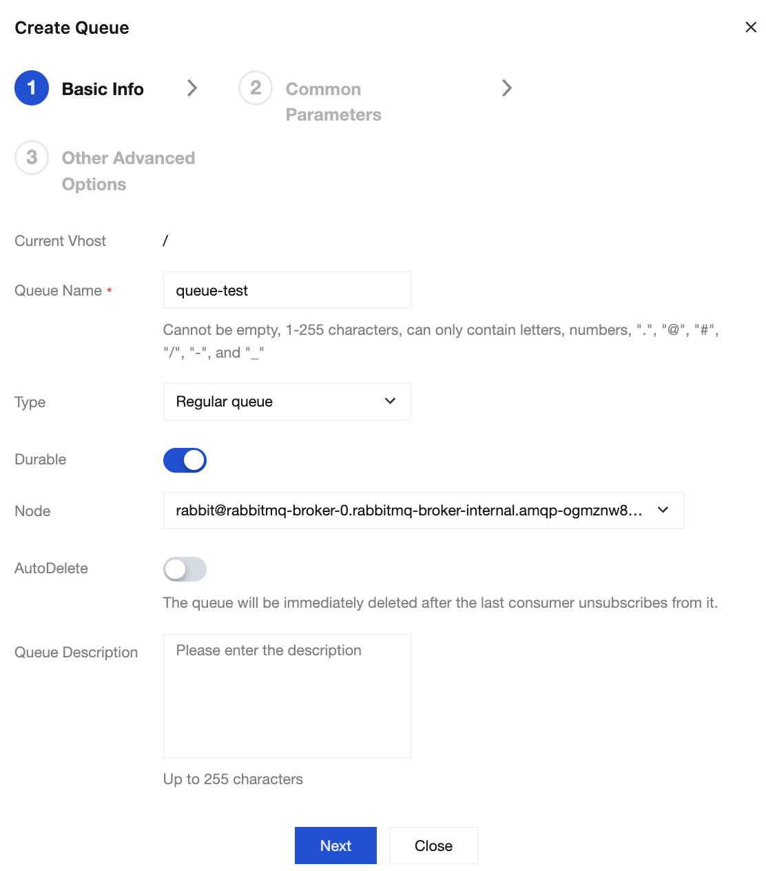 2. Enter the queue name, set the type to Normal Queue, and keep the default values for other options.