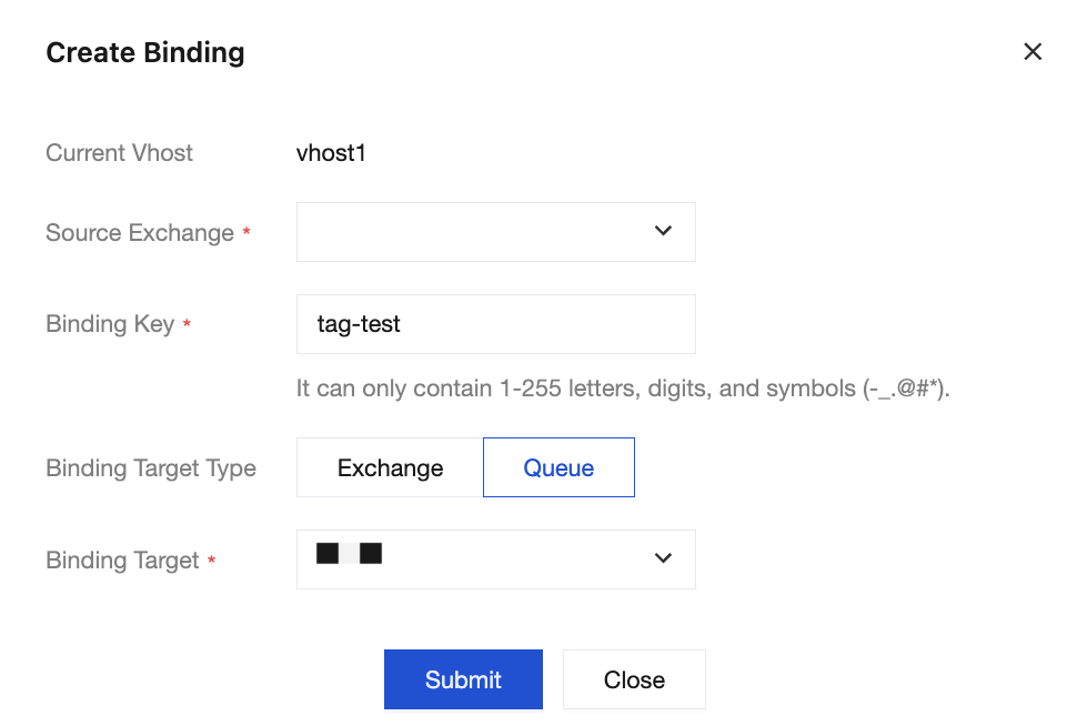 3. Set the newly created exchange to the source exchange, enter the Binding Key, set the binding type to queue, and set the newly created queue to the binding target.