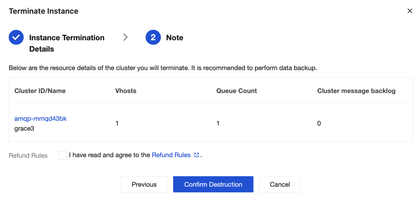 3. In the deletion dialog box, click Next. After the confirmation of the resource details, click Confirm Destruction, and then the cluster will enter the isolation period.