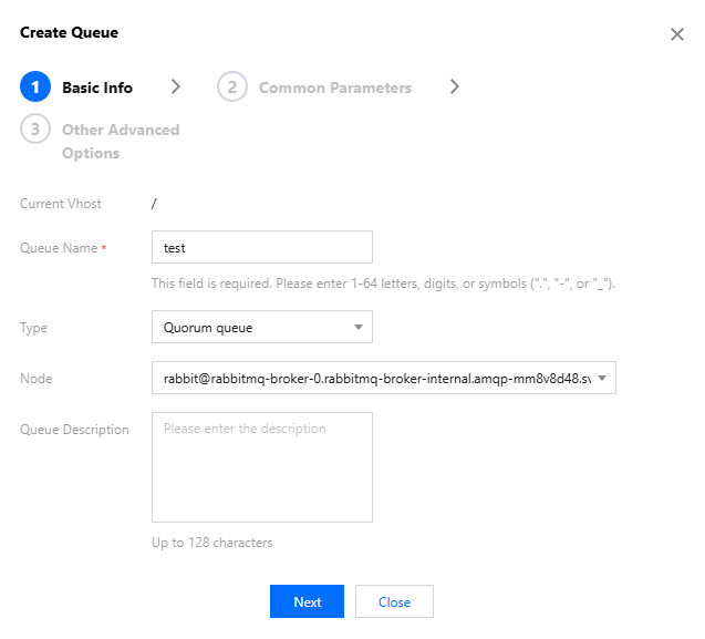 Basic Info | Current Vhost | Yes | Indicates which vhost the queue is being created for. |
