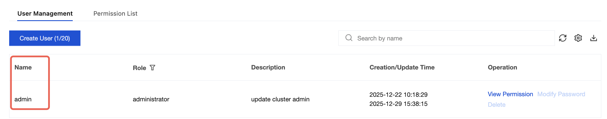The username can be obtained from the user management page in the console, and the password is the one you set when creating the user.