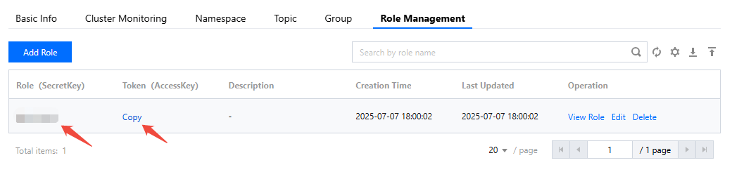 secretKey | Role name, copied from the SecretKey column on the role management page in the console. ![]() |