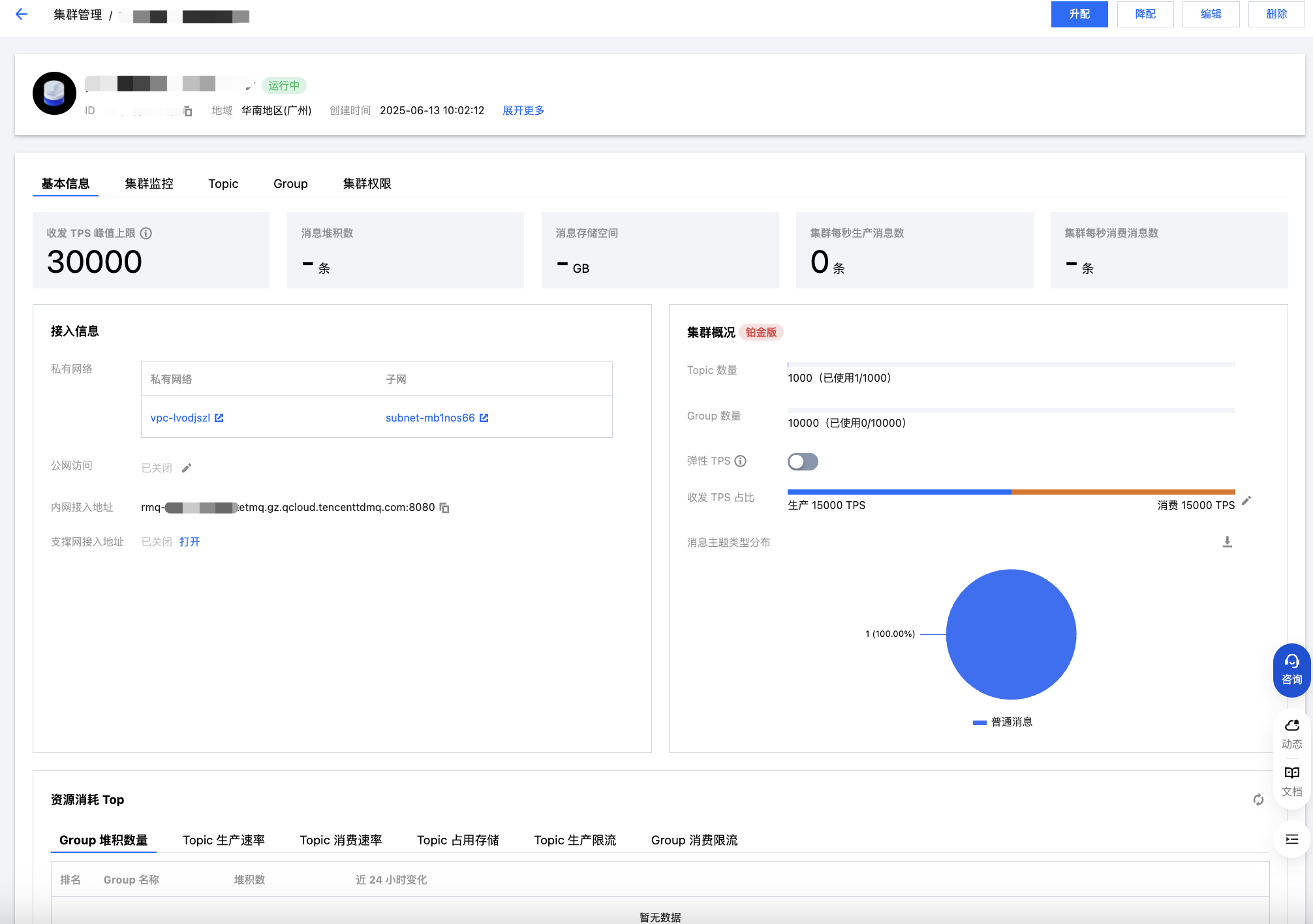Group 个数 | 是 | 默认 Topic 和 Group 的比例为 1 比 10 。Group 限额不收取费用,您可以通过调整 Topic 的个数来进行调整。 |