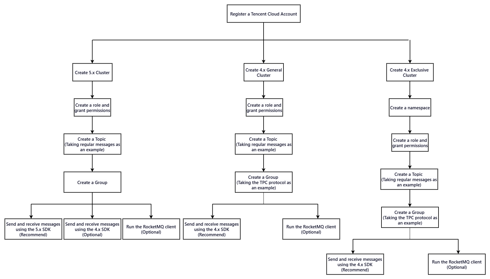 The quick start operation process varies based on cluster type. The process for sending and receiving messages using TDMQ for RocketMQ is as shown below.