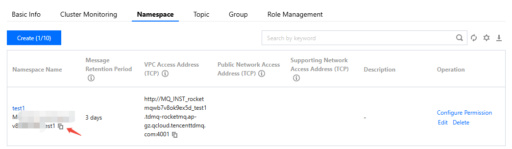 namespace | Copy the namespace name from the namespace page on the console. If you use a 4.x generic cluster or 5.x cluster, fill in the Cluster ID here. ![]() |
