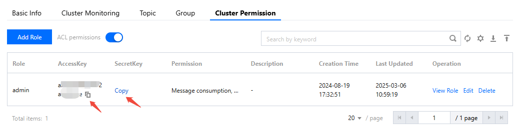 secretKey | Role name, copied from the SecretKey column on the Cluster Permission page in the console. |