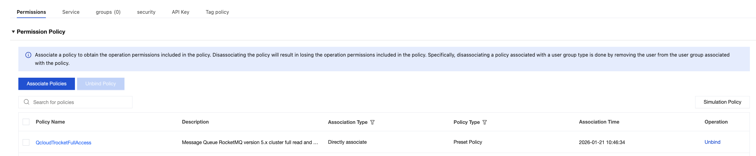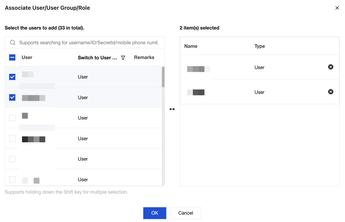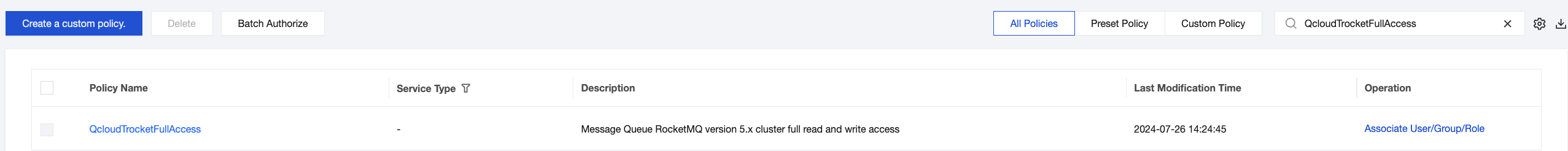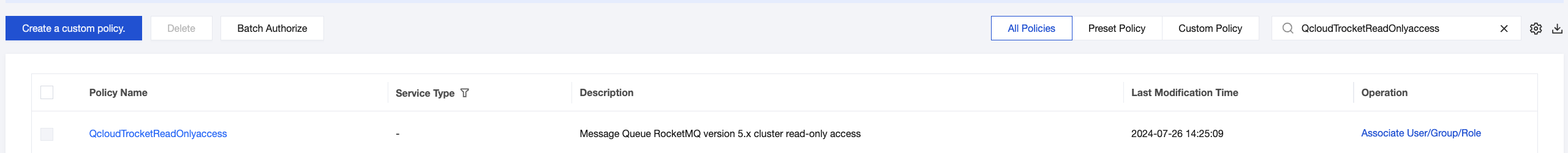 3. In the search results, click Associate User/Group/Role in the operation column and select the sub-account to be authorized. 4. Click OK to complete the authorization. This policy will appear in the user's policy list.