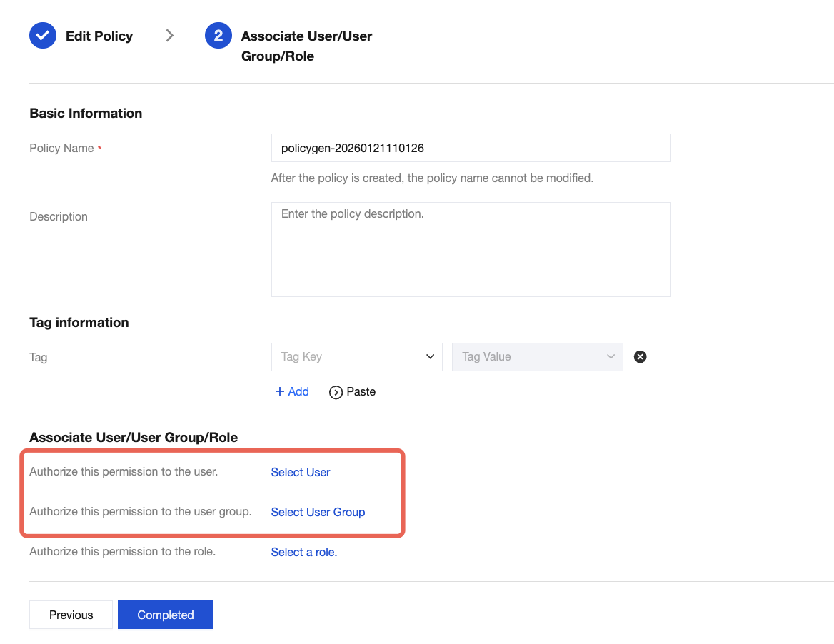 10. Click Completed. The relevant sub-accounts can control resources under the specified tags based on the policy.
