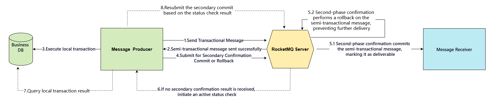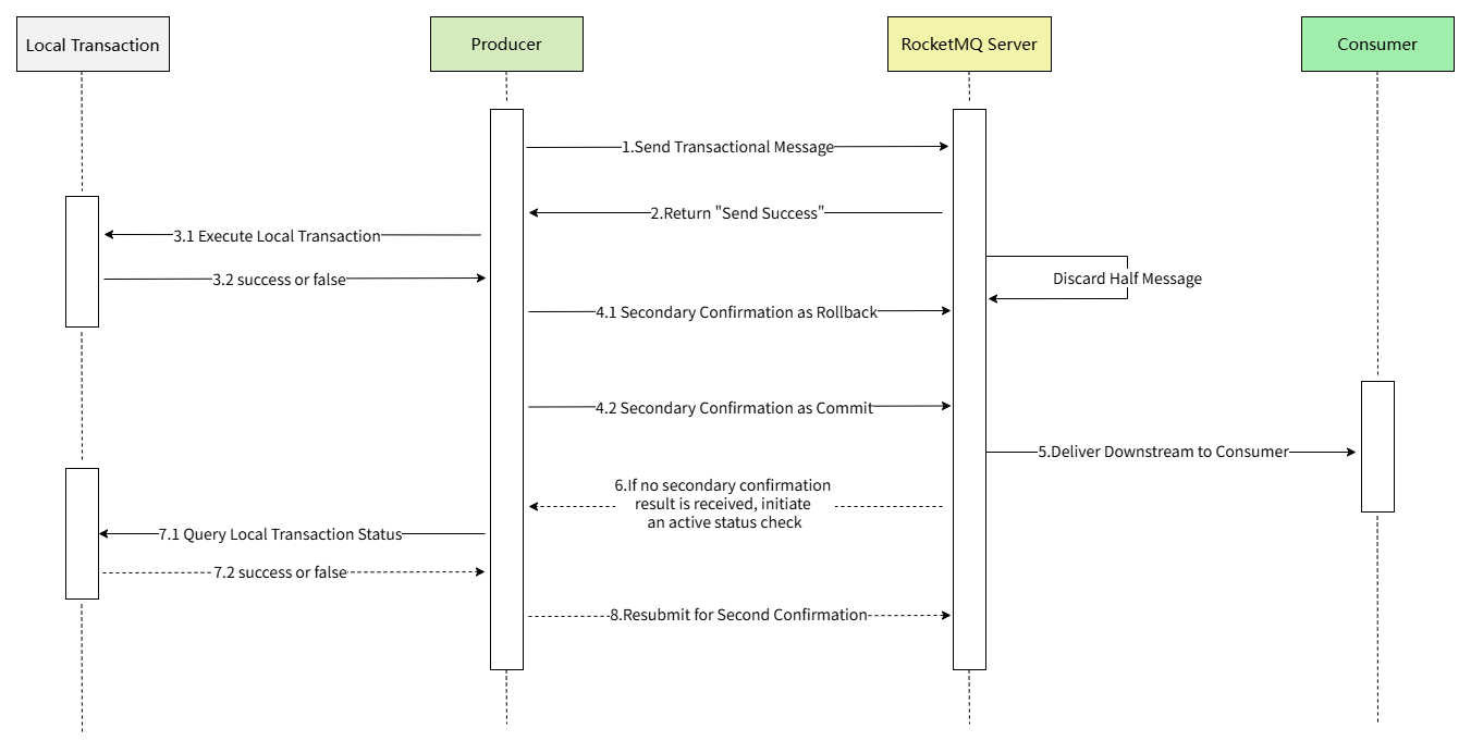 8. After receiving the request, the producer submits the secondary confirmation result, and the logic returns to Step 5. If the producer service is temporarily unavailable, the RocketMQ server proceeds to initiate check requests at specified intervals until the maximum number of checks is exceeded, at which point the message is rolled back.