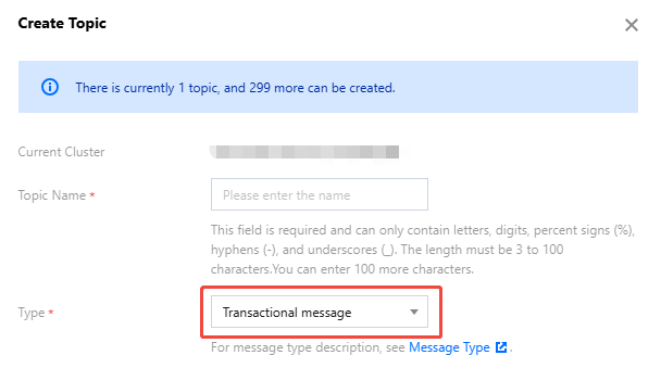 1. The topic type must be TRANSACTION. Otherwise, an error will occur during message production. Key error message: current message type not match with topic accept message types.