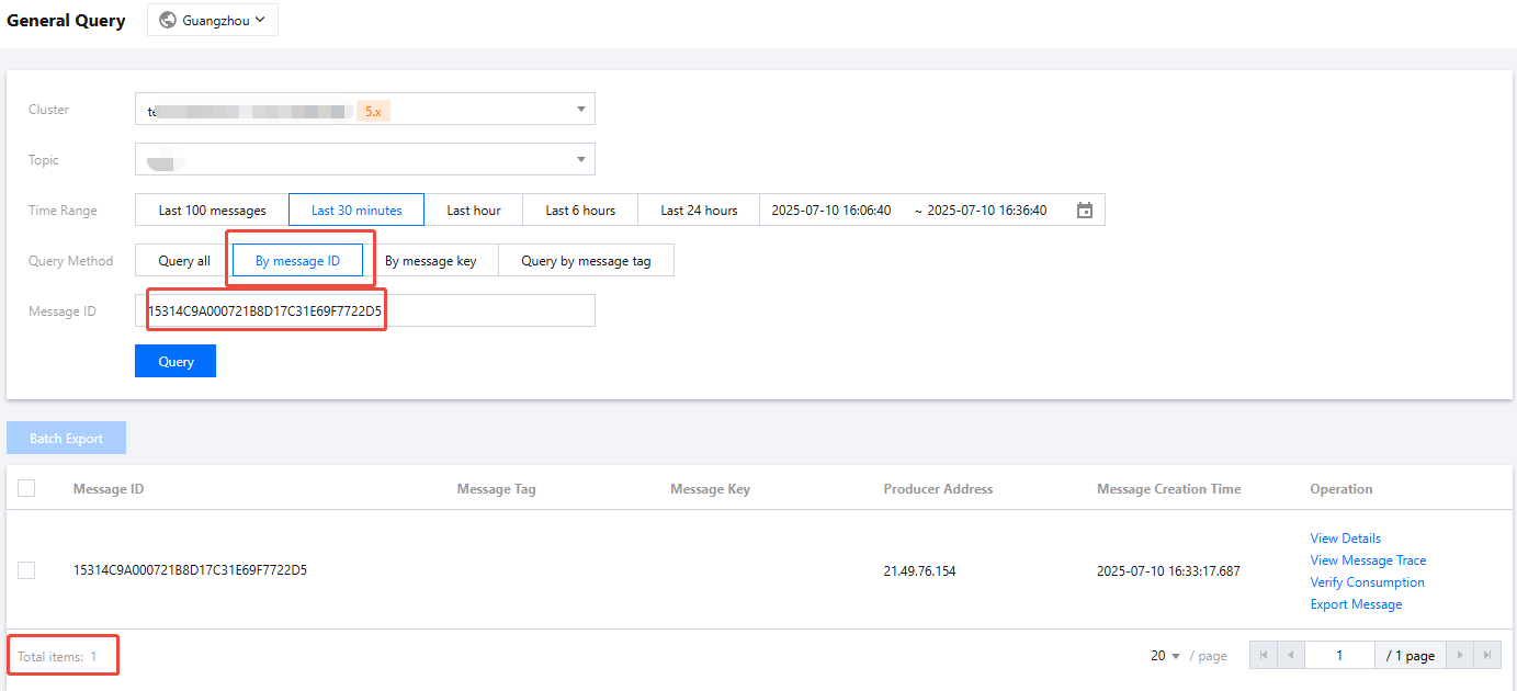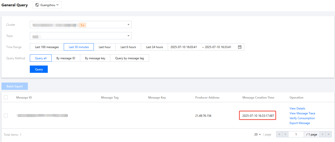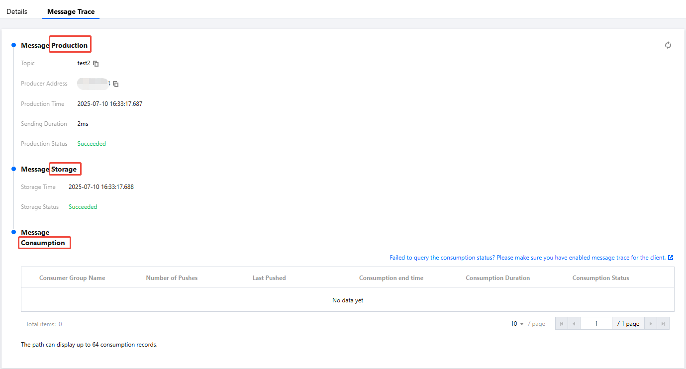 7. At this point, you can find that the message has been sent successfully, but it is not visible on the Message Query page in the console, and this message cannot be consumed even if you start the consumer.