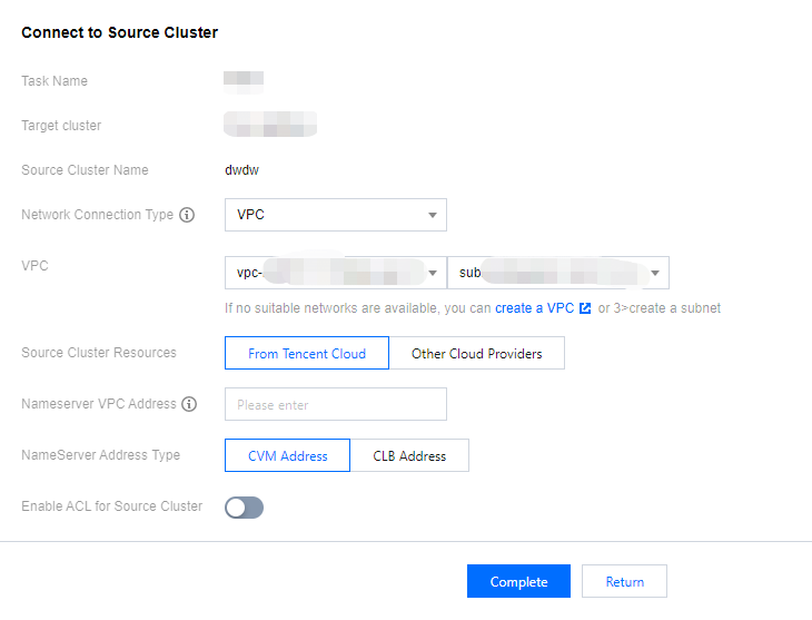 NameServer Address Type: This field is required only when you use a VPC network to access the source cluster. Depending on different user preferences, the NameServer address may be a Cloud Virtual Machine (CVM) address or Cloud Load Balancer (CLB) address on Tencent Cloud. Provide the actual address used. This information is solely used to distinguish between network connectivity scenarios and does not affect subsequent operations.