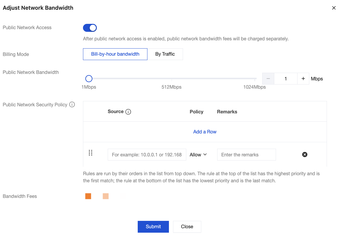 Billing Mode: By default, the billing mode for public network access is the same as that of the cluster. For example, if the cluster uses monthly subscription, public network access also uses monthly subscription by default. In addition, regardless of whether a cluster uses yearly/monthly subscription or postpaid by hour, the billing mode can be adjusted to pay-by-traffic.